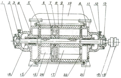 1、后軸承壓蓋 2、軸 3、軸承架 4、前后端蓋 5、短泵體 6、中間壁(B) 7、中間壁(A) 8、拉緊螺栓 9、長(zhǎng)泵體 10、連通管 11、調(diào)整墊 12、油杯 13、前軸承壓蓋 14、填料壓蓋 15、后蓋園盤 16、短葉輪 17、長(zhǎng)葉輪 18、泵聯(lián)軸器 19、電機(jī)聯(lián)軸器 20、軸套 21、進(jìn)水孔 22、前蓋園盤