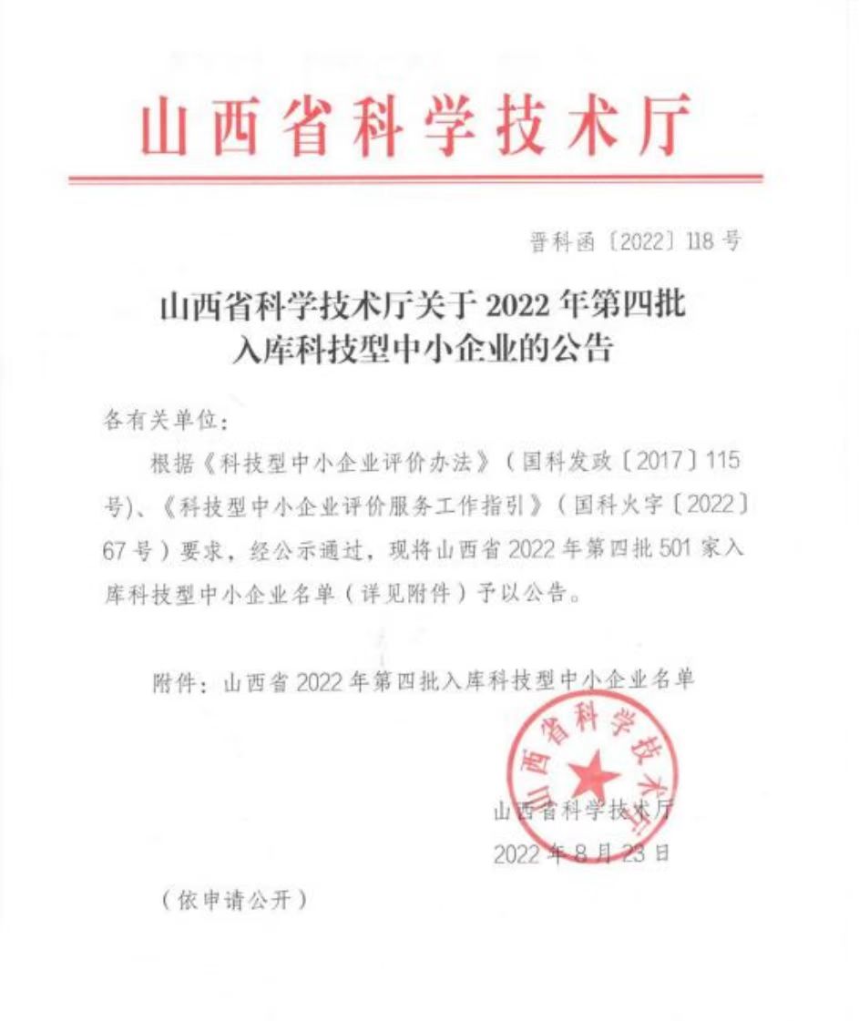 根據(jù)《科技型中小企業(yè)評價辦法》(國科發(fā)政[2017]115號)、《科技型中小企業(yè)評價服務(wù)工作指引》(國科火字[2022]67號)要求,經(jīng)公示通過,我公司入庫2022年第四批科技型中小企業(yè)。